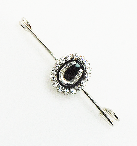 10 x 8mm black onyx oval gemstone in Swarovski crystal setting with mini horse shoe motif on 2" stock pin plated faux rhodium