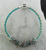 ROYAL BLUE MED/LARGE BRAIDED LEATHER JOPPA BEAD STARTER BRACELET USING RANDOM HORSE SHOE BEAD ALONG WITH OTHER ASSORTED BEADS WITH SAPPHIRE COLORED...