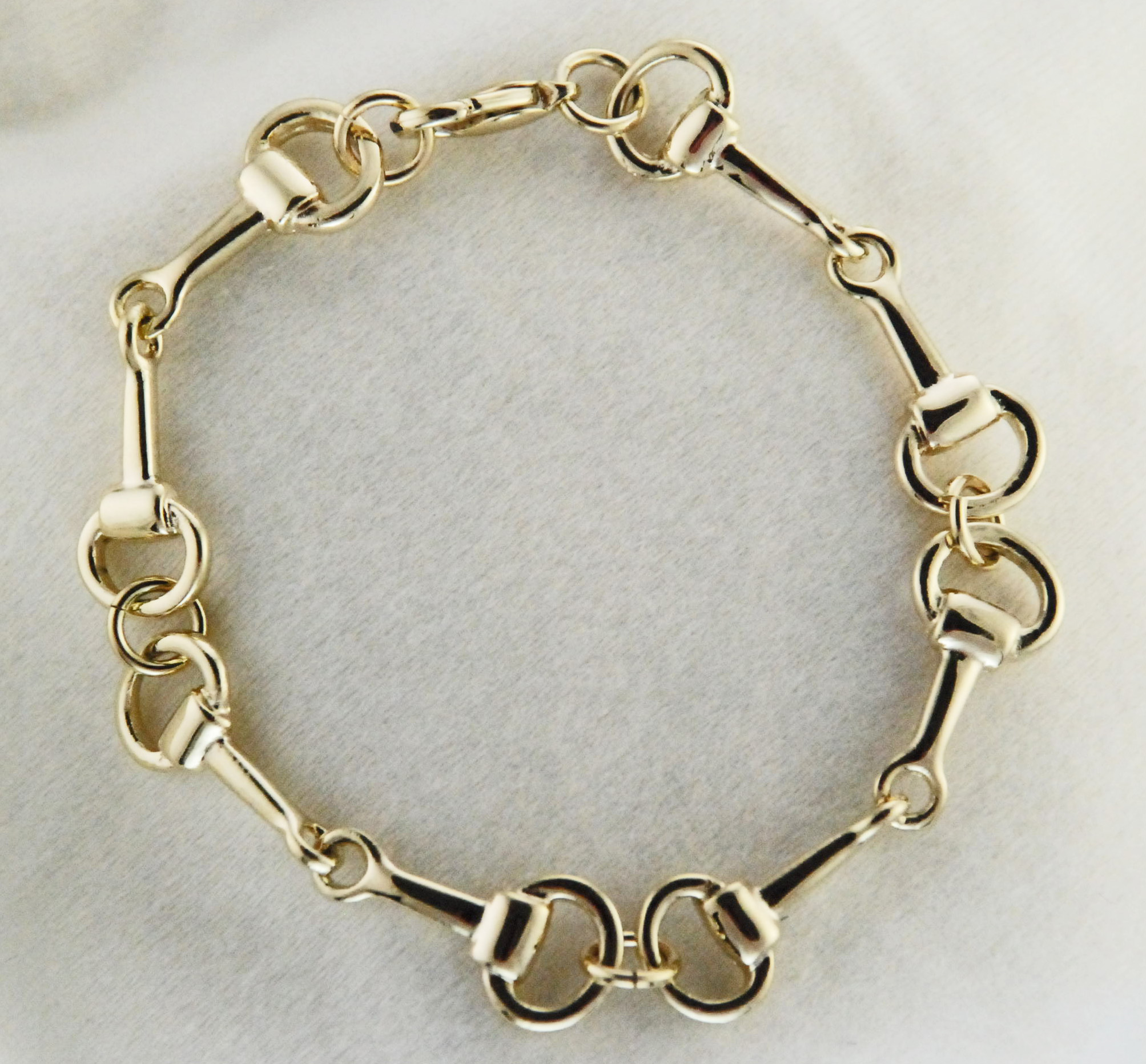 Medium sized polished snaffle bit bracelet plated 14 kt gold